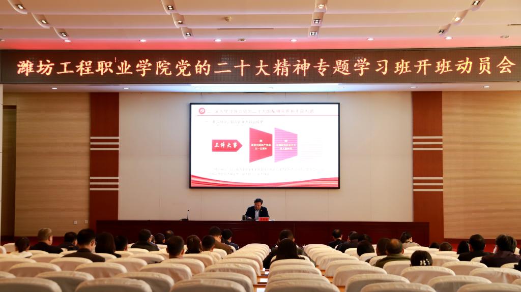 为学习好、宣传好、贯彻好党的二十大精神,激励教职工坚定信心、砥砺奋进、锐意进取,11月17日,我院党的二十大精神专题学习班开班动员会暨党的二十大精神宣讲报告会在学术报告厅隆重举行,党委书记肖明胜作开班动员,并宣讲党的二十大精神,学院领导班子成员及各单位党政负责同志在学术报告厅参加,全体师生通过线上直播方式收听收看。