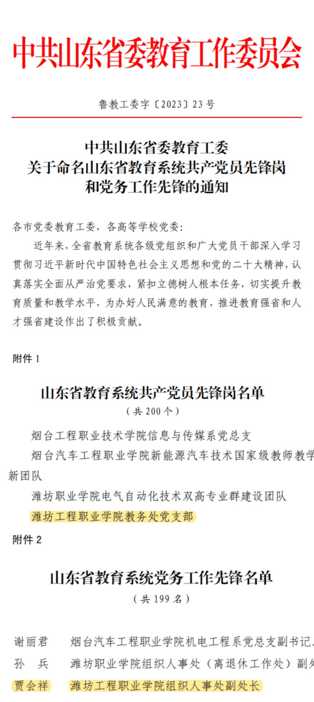 近日,省委教育工委公布了山东省教育系统共产党员先锋岗和党务工作先锋名单,我院教务处党支部被命名为“山东省教育系统共产党员先锋岗”,贾会祥同志被命名为“山东省教育系统党务工作先锋”。