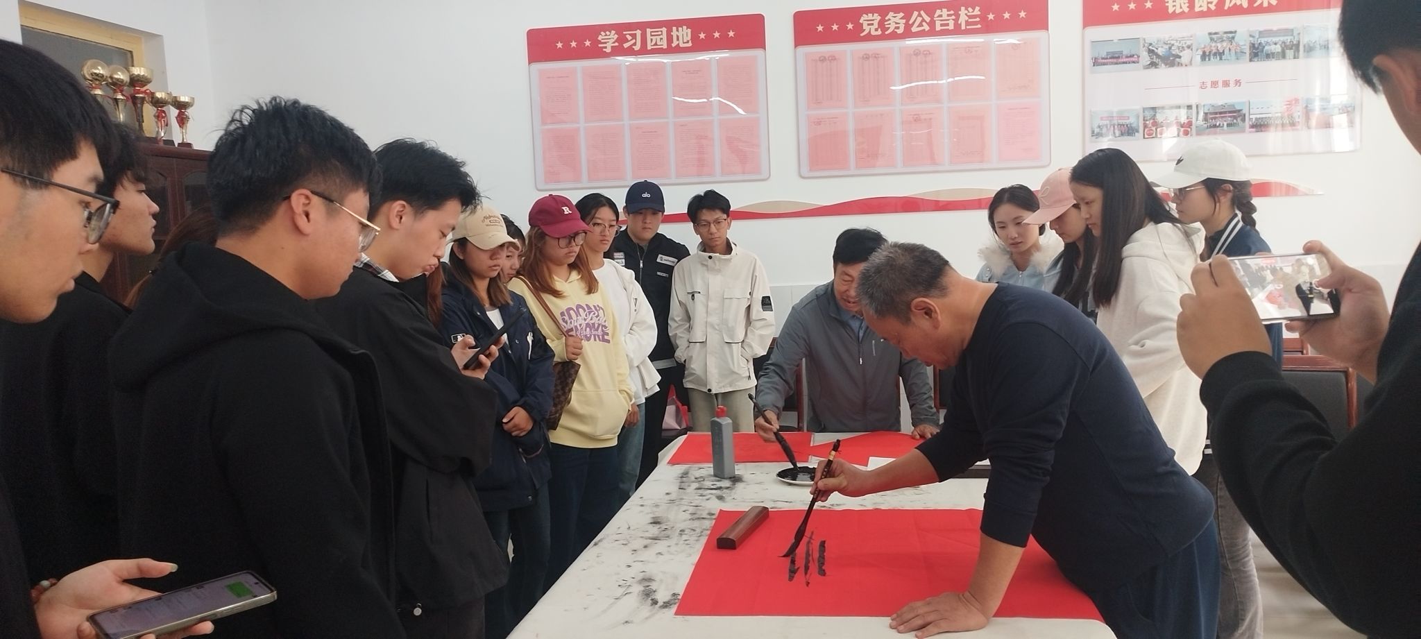 书画创作区同样气氛热烈。老干部书画爱好者现场挥毫泼墨,以笔寄情、以画言志,一幅幅笔力遒劲、意境深远的书法作品,一幅幅色彩绚丽、充满生机的绘画作品,不仅展现了老干部们深厚的艺术功底,更传递出对祖国繁荣昌盛的由衷赞美。创作间隙,老干部们主动向围观的青年师生讲解笔法技巧、分享创作理念,将书法绘画中的文化内涵与爱国情怀娓娓道来。青年学子们认真聆听、细心观摩,不时提问交流,在笔墨互动中感受传统文化魅力与老一辈的赤子之心。