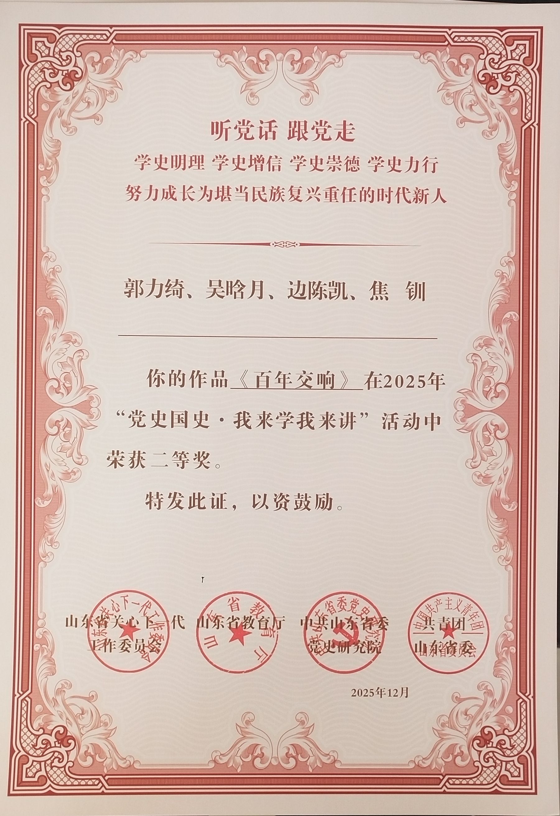 二等奖获奖作品《百年交响》,参演人员:郭力绮、吴晗月、边陈凯、焦钏,指导老师:王帅、牟晓萌